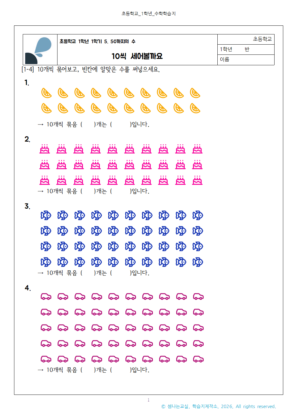 들어가며 이번 학습지는 초등학교 1학년 5단원의 ’50까지의 수’ 차시 중 10씩 세어볼까요 차시와 관련이 있습니다. 몇십을 세어보는 경험을 위해 10씩 묶어서 세어보는 연습문제를 구성하였습니다. [1-4] 10씩 묶고, 몇십인지 숫자로 쓰기 [5-7] 무작위로 놓여있는…